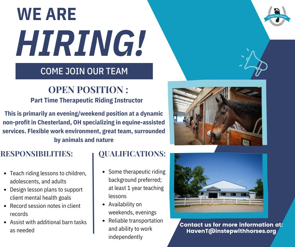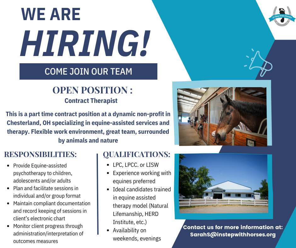 Job Description: This is a contract position at a dynamic non-profit in Chesterland, OH specializing in equine-assisted services and therapy. Flexible work environment, great team, surrounded by animals and nature.